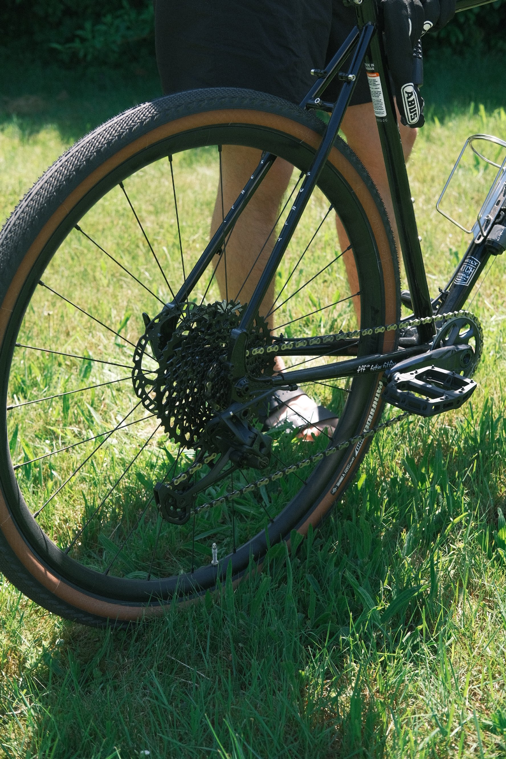 The rest of the components are less specialized but still very functional and budget-friendly. We got the wheelset from eBay, the brakes are simple mechanical ones from Shimano with pads you can find anywhere. The tires are currently still tubed tires from Specialized, but at 47c, they provide plenty of comfort. The saddle is a Brooks C17 that came from my old parts bin and fits perfectly.
